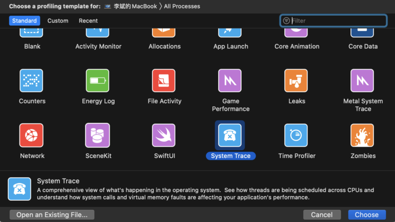 Instruments, 选择 System Trace(系统跟踪) 可以查看缺页中断( page fault) -