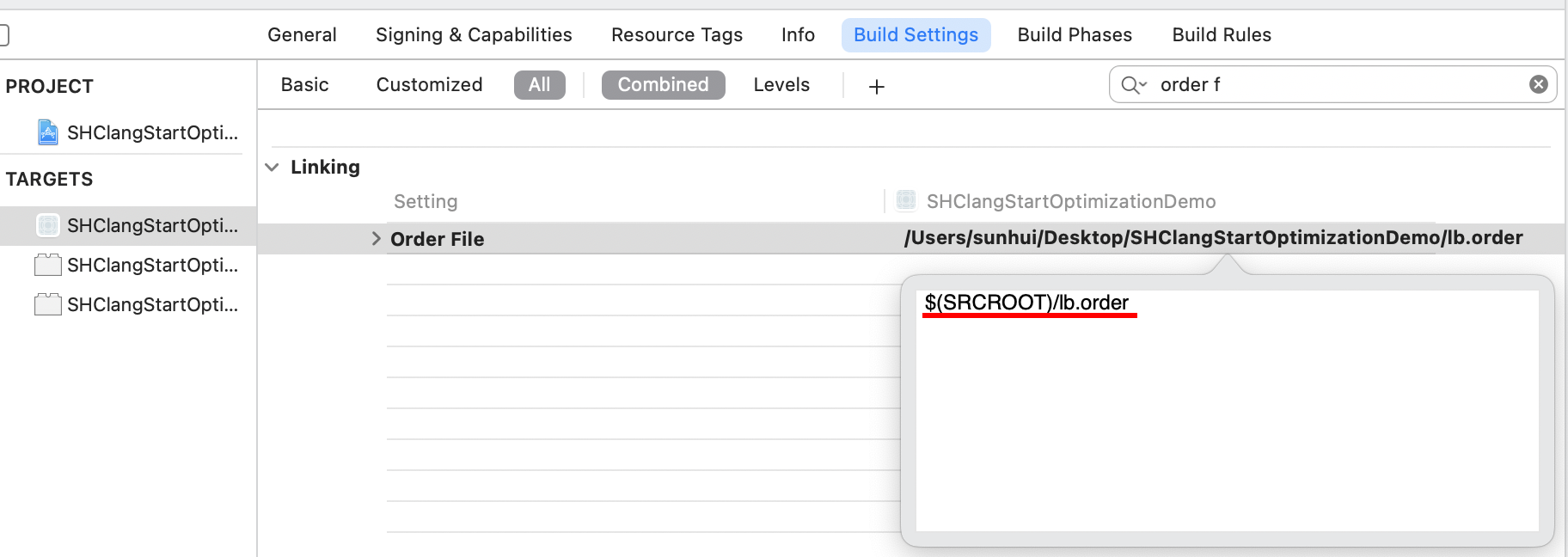 配置Order File的文件路径 通过配置Xcode的链接器ld的Order File的文件路径,在Order File中,将需要的符号按顺序写在里面, 当工程 build 的时候 , Xcode 会读取这个文件 , 打的二进制包就会按照这个文件中的符号顺序进行生成对应的 mach-O。