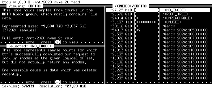 btdu is a sampling disk usage profiler for btrfs. It works according to the following algorithm: