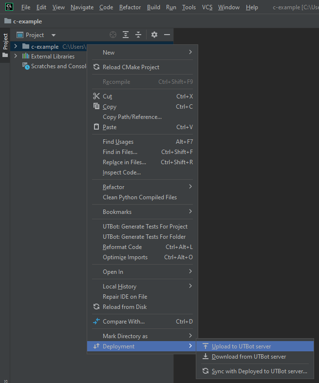 If the UnitTestBot C/C++ server and the CLion plugin are installed on different machines, or the server is installed via Docker, you have to use the Deployment feature.