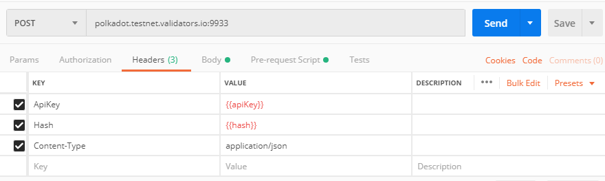 Headerstab and addApiKeyandHashheaders. Use postman variable syntax for them inValuecolumn. These variables will be updated for each request using the pre-request script.