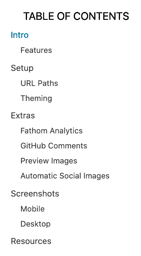 By default, every article page will have a table of contents displayed as an aside on desktop. It uses scrollspy logic to automatically update the current section as the user scrolls through your document, and makes it really easy to jump between different sections.