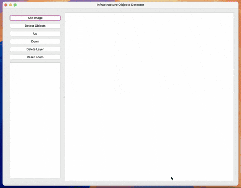 The software is a desktop application that detects infrastructure objects and displays them in a GUI built with PyQt6. It allows users to load satellite images, visualize detected features, and manage layer interactions.