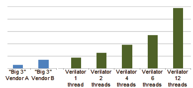 Verilator has typically similar or better performance versus closed-source Verilog simulators (e.g., Carbon Design Systems Carbonator, Modelsim/Questa, Cadence Incisive/NC-Verilog, Synopsys VCS, VTOC, and Pragmatic CVer/CVC). But, Verilator is open-sourced, so you can spend on computes rather than licenses. Thus, Verilator gives you the best simulation cycles/dollar.