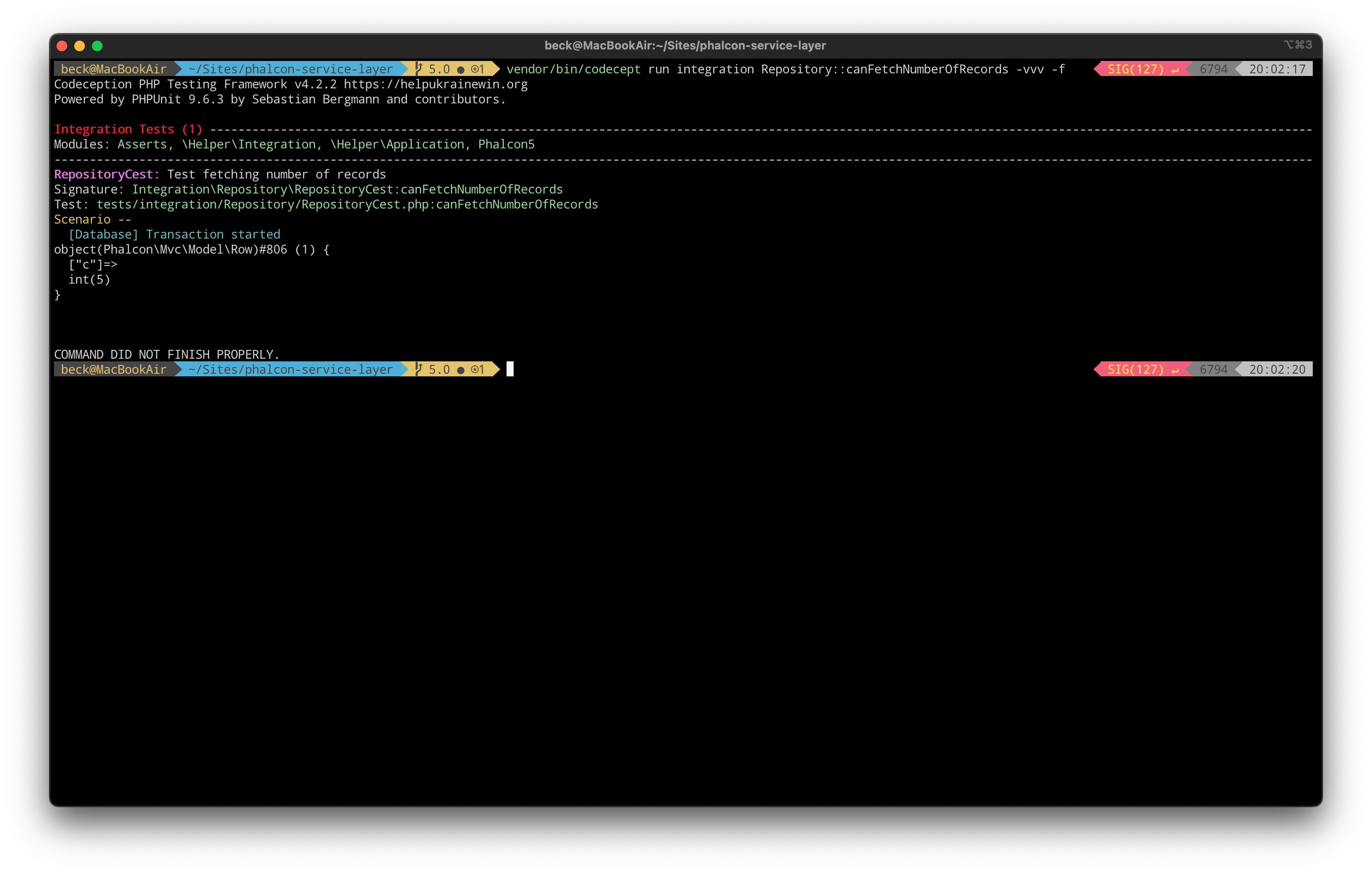 Hi, Run the following integration test from the project directory: vendor/bin/codecept run integration Repository::canFetchNumberOfRecords -vvv -for the cache version: vendor/bin/codecept run integration Repository::canCacheFetchRecordCount -vvv -fand you will see both tests return (int) 5 as expected—both tests call the method: fetchColumn(). Moreover, if you open src/Repository/QueryRepository.php (concrete implementations without cache) and goto L71 (inside the method fetchColumn) and place: and re-run the test, you will see: object(Phalcon\Mvc\Model\Row)#806 (1) {