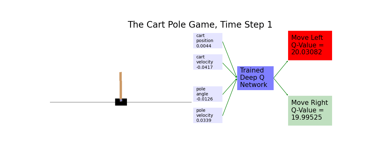 When the number of possible scenarios is too large, we use a deep neural network to approximate the Q values. You'll put the graph of the cart pole on the left. You'll draw on the right the Q-values of moving the cart left and moving the cart right, respectively. The move with higher Q-value is then highlighted in red.