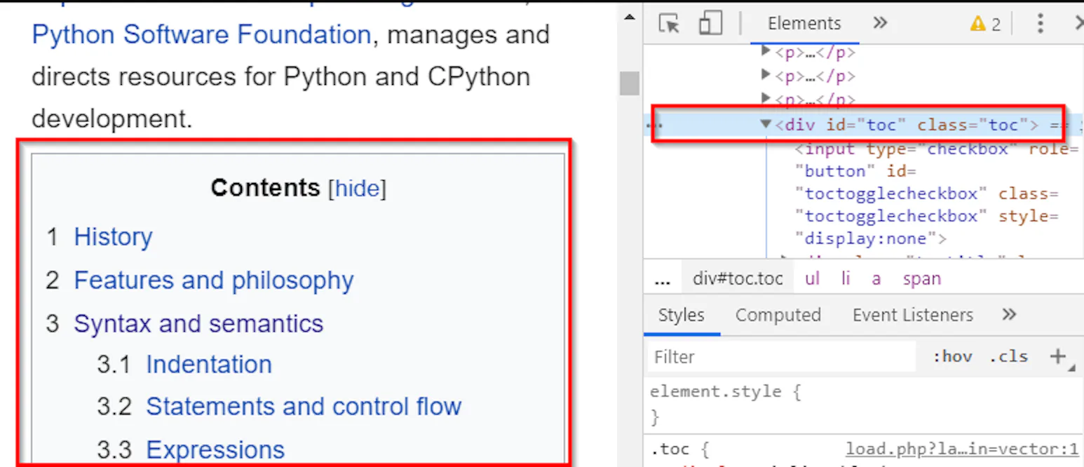 Open the url https://en.wikipedia.org/wiki/Python_(programming_language) in Chrome or Firefox, right click any item in the table of contents, and click Inspect. This will show that the text that we need is in <div id="toc" class="toc">