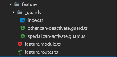 If you have guards that are only used in a particular FeatureRoutes array, then store these routes underneath a folder named _guards underneath your feature folder. Make sure to follow the same naming conventions defined above, as well as barrel exporting.